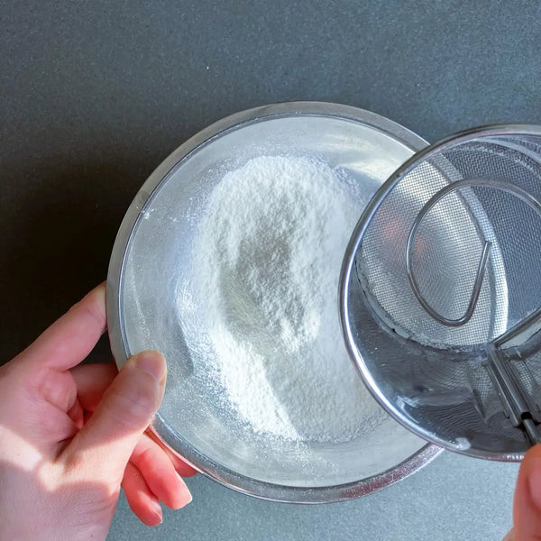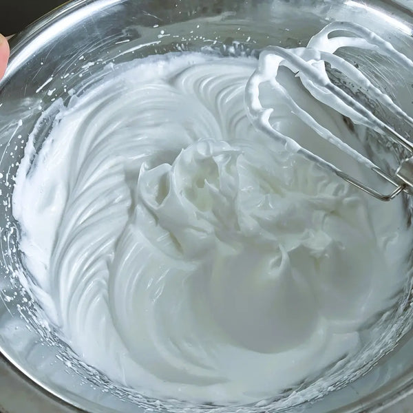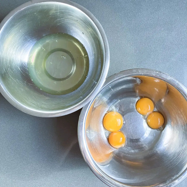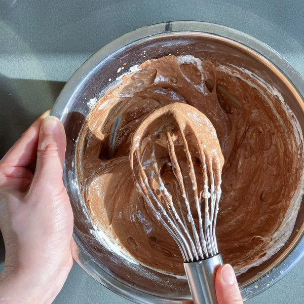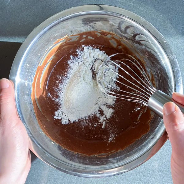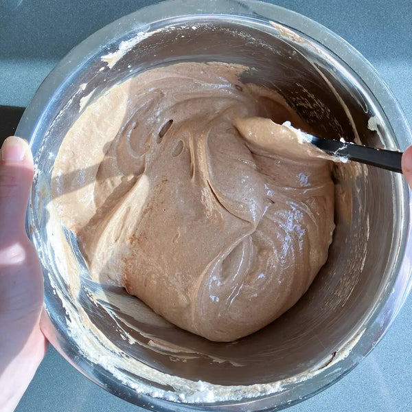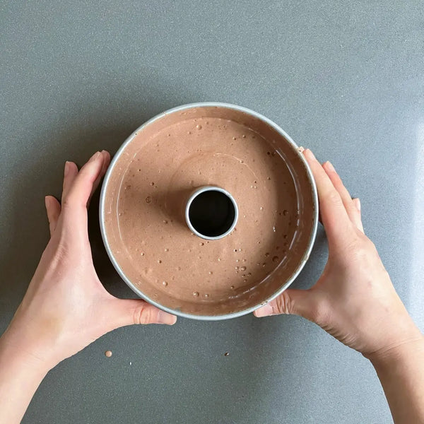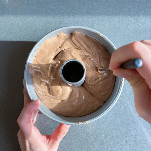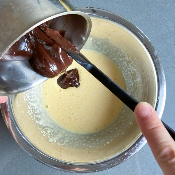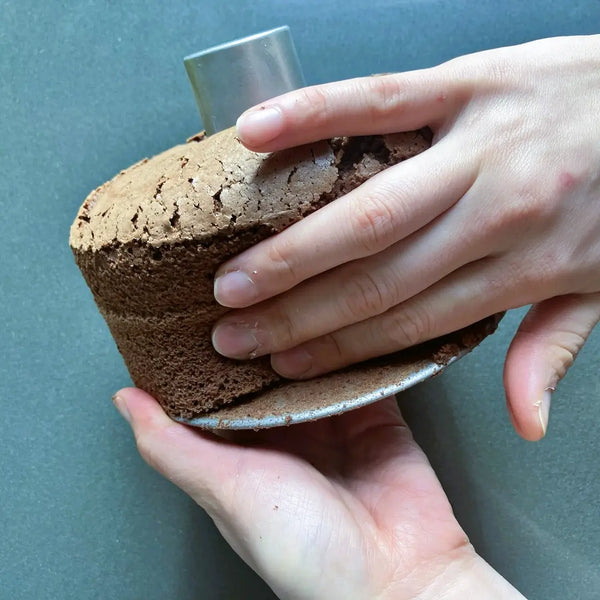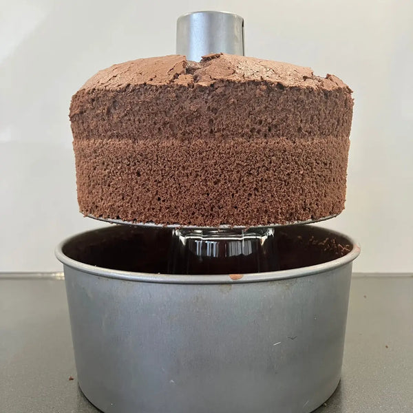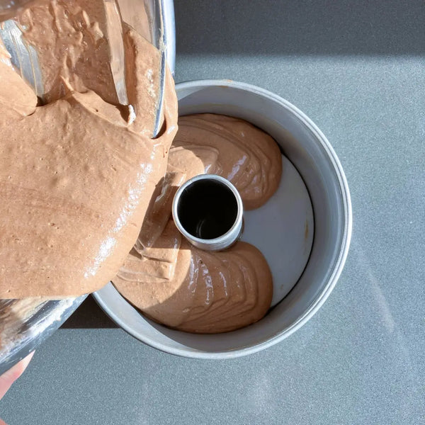 The key to making a good chiffon cake is the meringue. You must whip it enough to achieve a stiff meringue. It's important to quickly mix the batter and meringue and place it in a mold because chocolate contains fat and oil, which can easily collapse the air bubbles in the meringue.