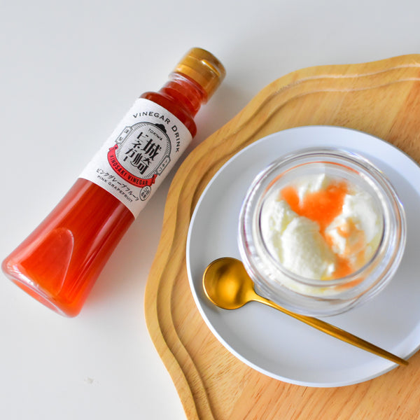 This recipe is an easier and quicker option thanks to Tokiwa Japanese Drinking Vinegar Pink Grapefruit Flavor, which offers a similar bright citrus flavor without making syrup from scratch. Simply dilute it about five times with water, sparkling water, or milk, or pour it directly over yogurt or shaved ice as a refreshing topping. Like homemade grapefruit syrup, it can also be used in drinks or desserts.