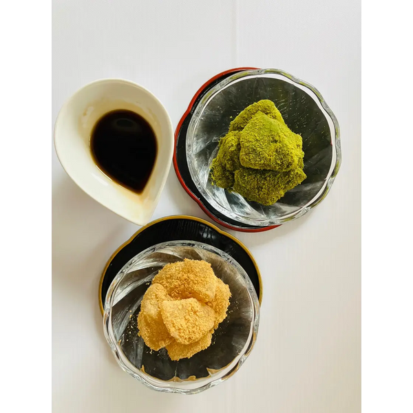 In the case of matcha warabi mochi, matcha powder is combined with kinako powder to create a uniquely nutty and earthy flavor. Once you drizzle kuromitsu (brown sugar) syrup over the top, you've got a perfectly harmonized dessert.