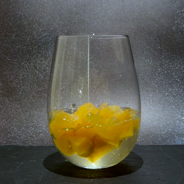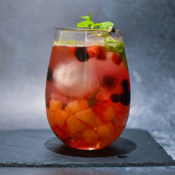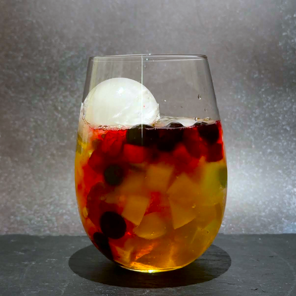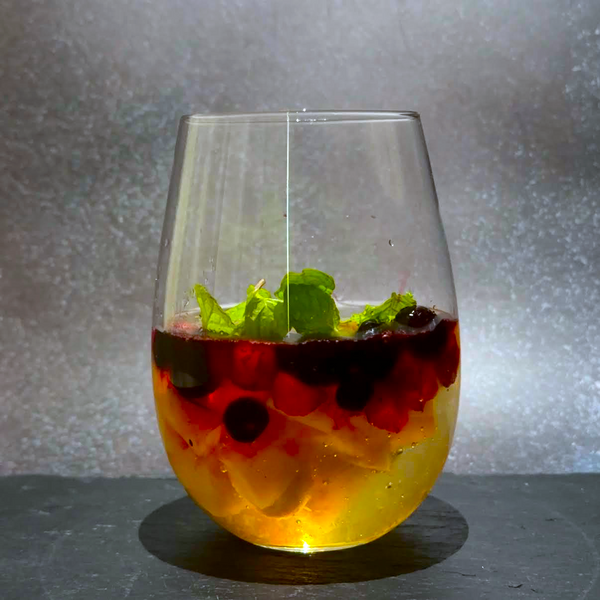 A wine glass adds a festive, elegant touch, but copper tumbler is also a great option. I named this cocktail “Fizzy Plum Delight.” It carries a fruity, refreshing flavor from the mint leaves, and the natural pink color from the berries gives it an elegant touch, perfect during or after meals on festive days. Umeshu adds sweet, fruity depth, and combined with fresh fruits, jelly, and sparkling water, it's super refreshing!
