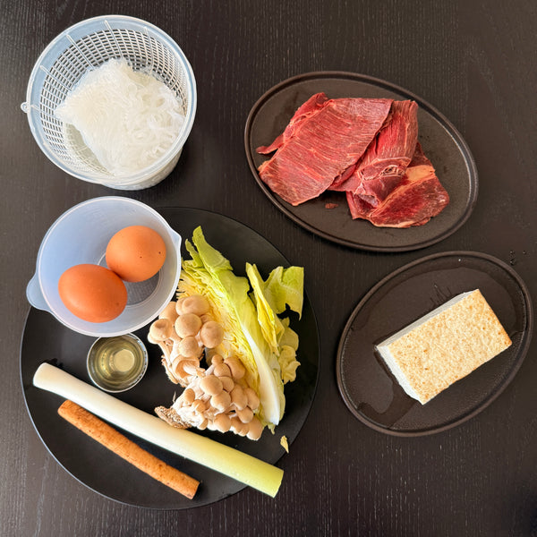 The dish typically includes ingredients like grilled tofu, konjac noodles (shirataki), cabbage, mushrooms, burdock root, and Japanese leek. These are simmered with the warishita sauce until tender. The thin slices of horse meat are added toward the end of cooking to ensure they remain tender and juicy, overcooking will toughen them.